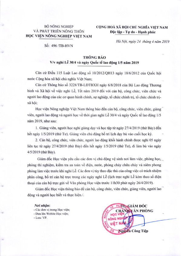 Thông báo về việc nghỉ Lễ 30/4 và ngày Quốc tế lao động 1/5 năm 2019