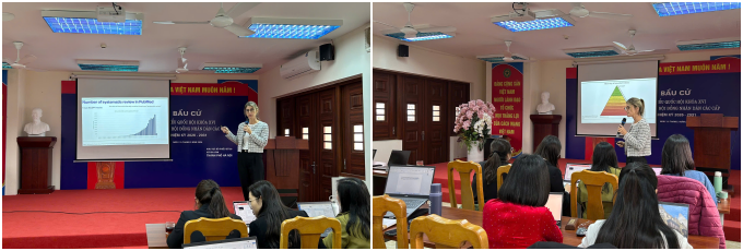 Trong khuôn khổ chương trình, TS. Kinga Biró đã giới thiệu tổng quan về mục tiêu và nội dung chính của buổi làm việc, đồng thời chia sẻ kinh nghiệm quốc tế trong việc triển khai các nghiên cứu tổng quan hệ thống và phân tích thư mục trong lĩnh vực khoa học xã hội và sức khỏe cộng đồng. Những chia sẻ từ chuyên gia đã mang đến góc nhìn thực tiễn về cách thức thiết kế và triển khai các nghiên cứu tổng quan theo chuẩn mực quốc tế.