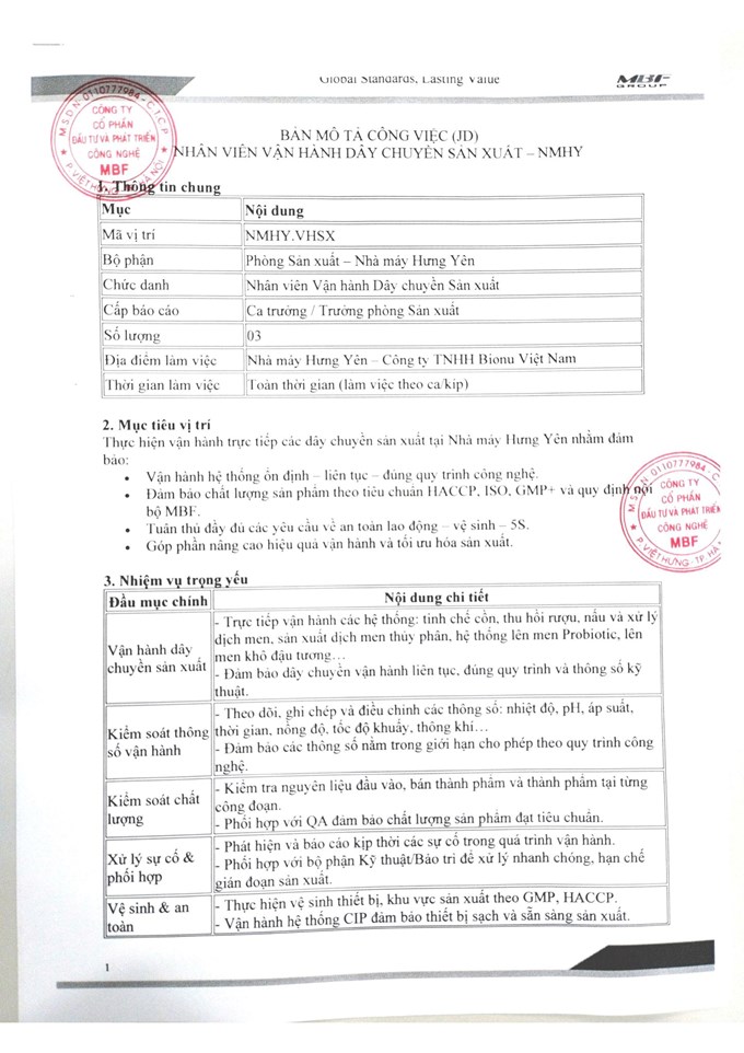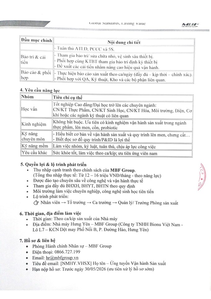 Địa điểm làm việc: Nhà máy Hưng Yên